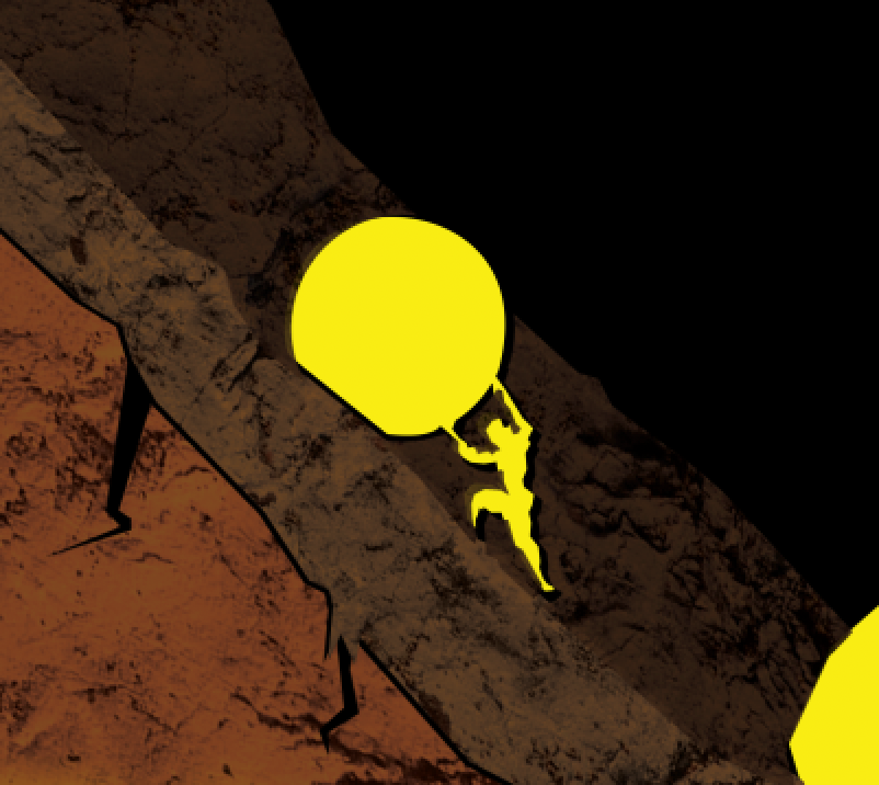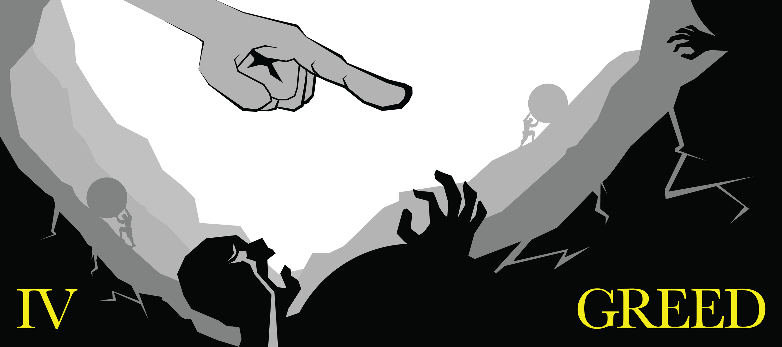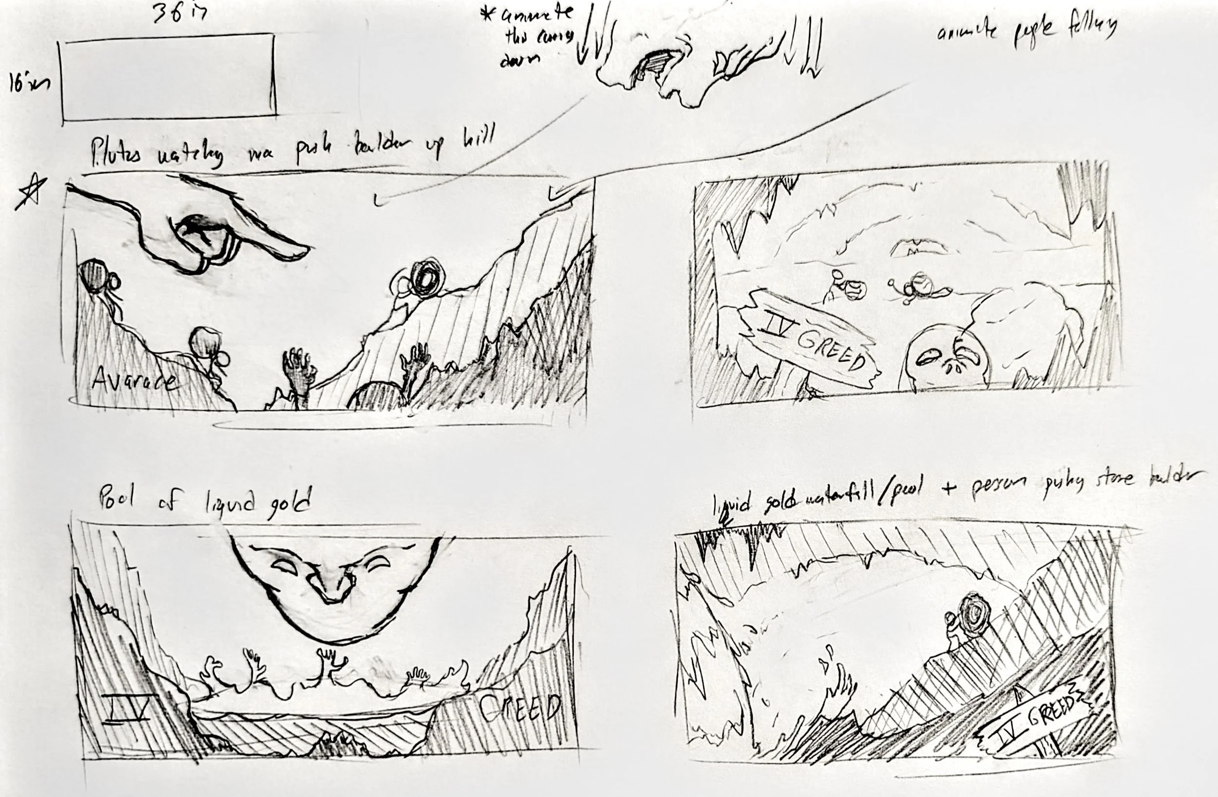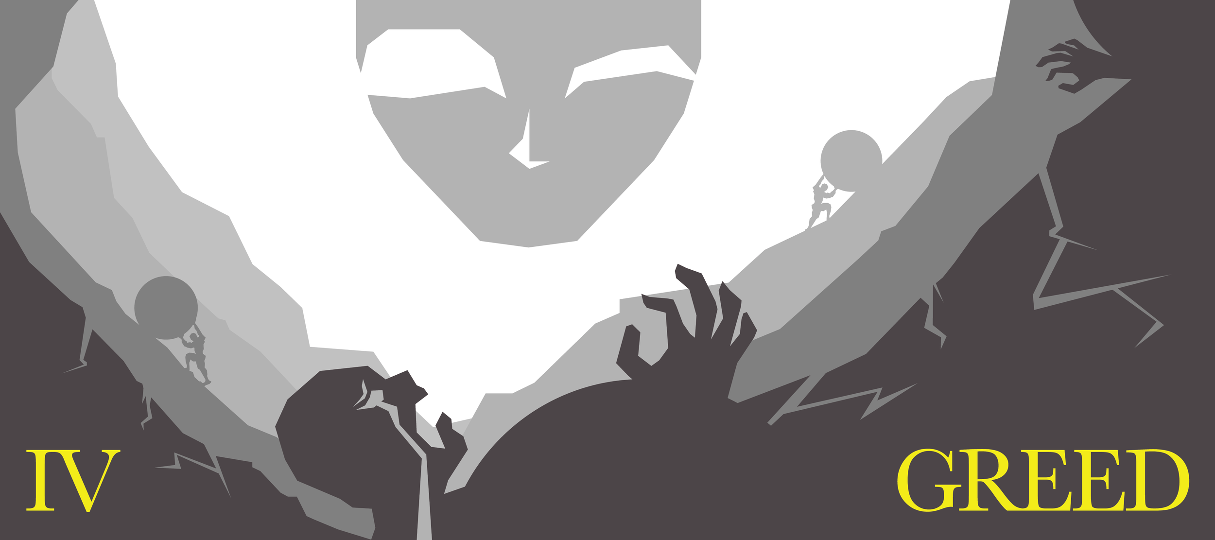 Dante’s depiction of the lost souls shoving boulders strongly influenced the creation of a rugged terrain that symbolically reflected their punishment within a fitting environment. A suspended face surveying the terrain worked best to illustrate Plutus's influence and guardianship of the fourth circle. The darkened foreground and lightened background elements established a foundation for simplified areas of detail.