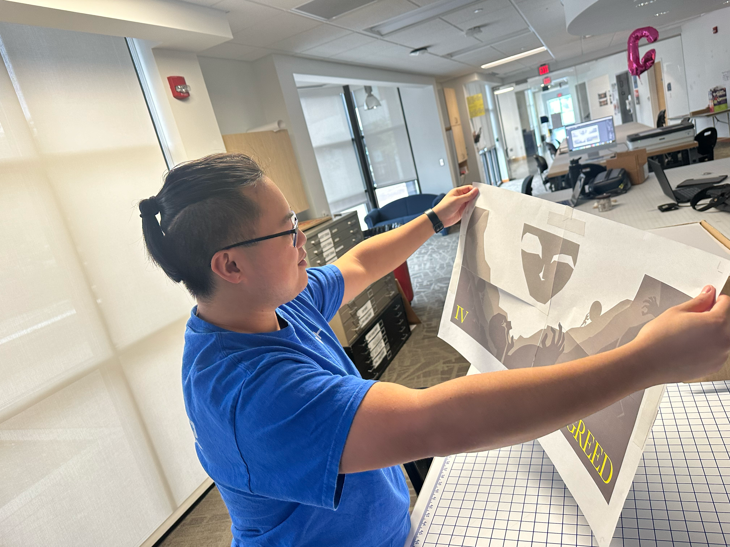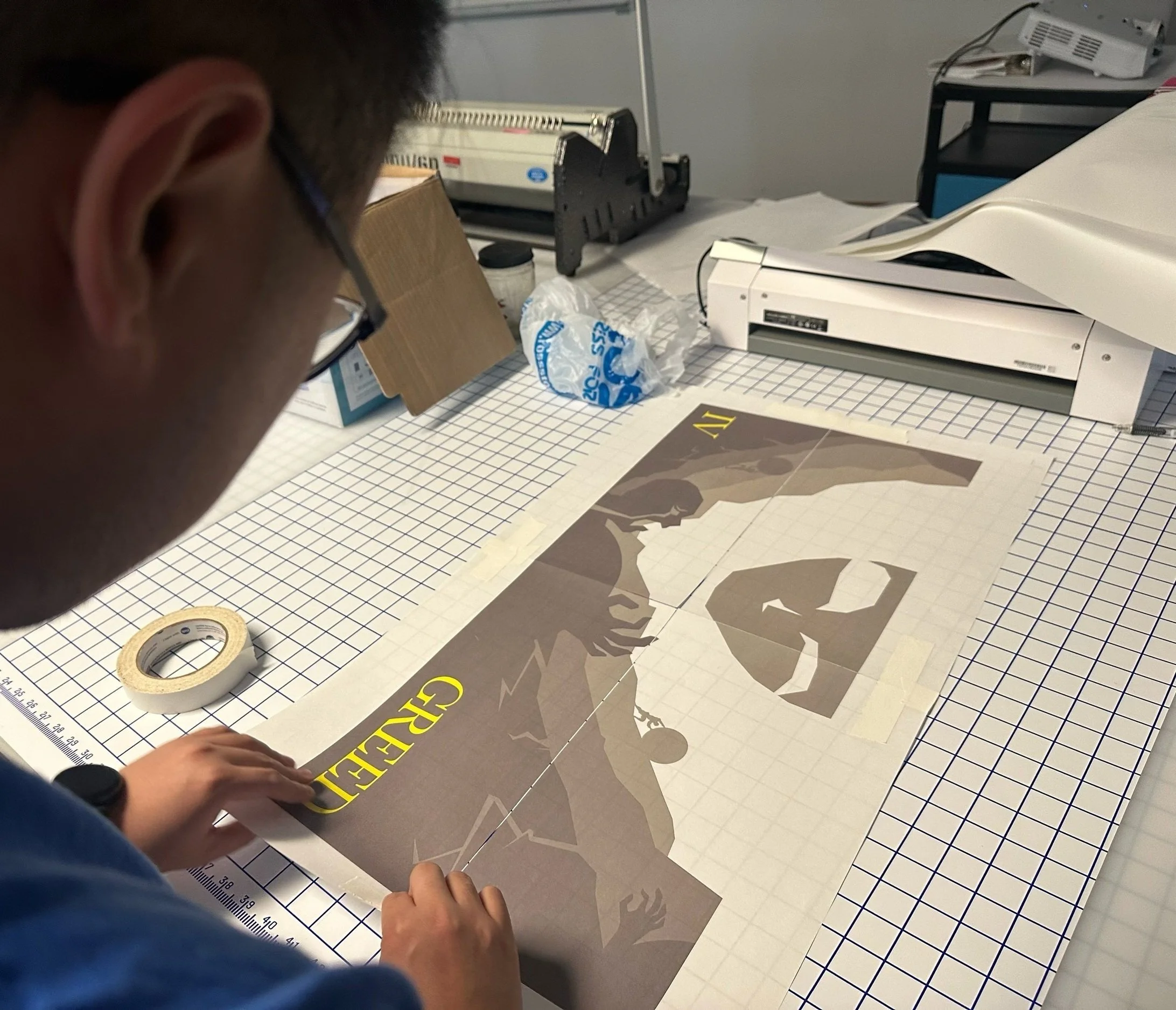 Evaluating the animations on a single tabloid-sized sheet proved inefficient due to the limited space available, thus I printed on and connected four sheets for improved higher resolution. It allowed for a closer approximation to the actual size of the display poster while experimenting with various combinations of printed and projected color.