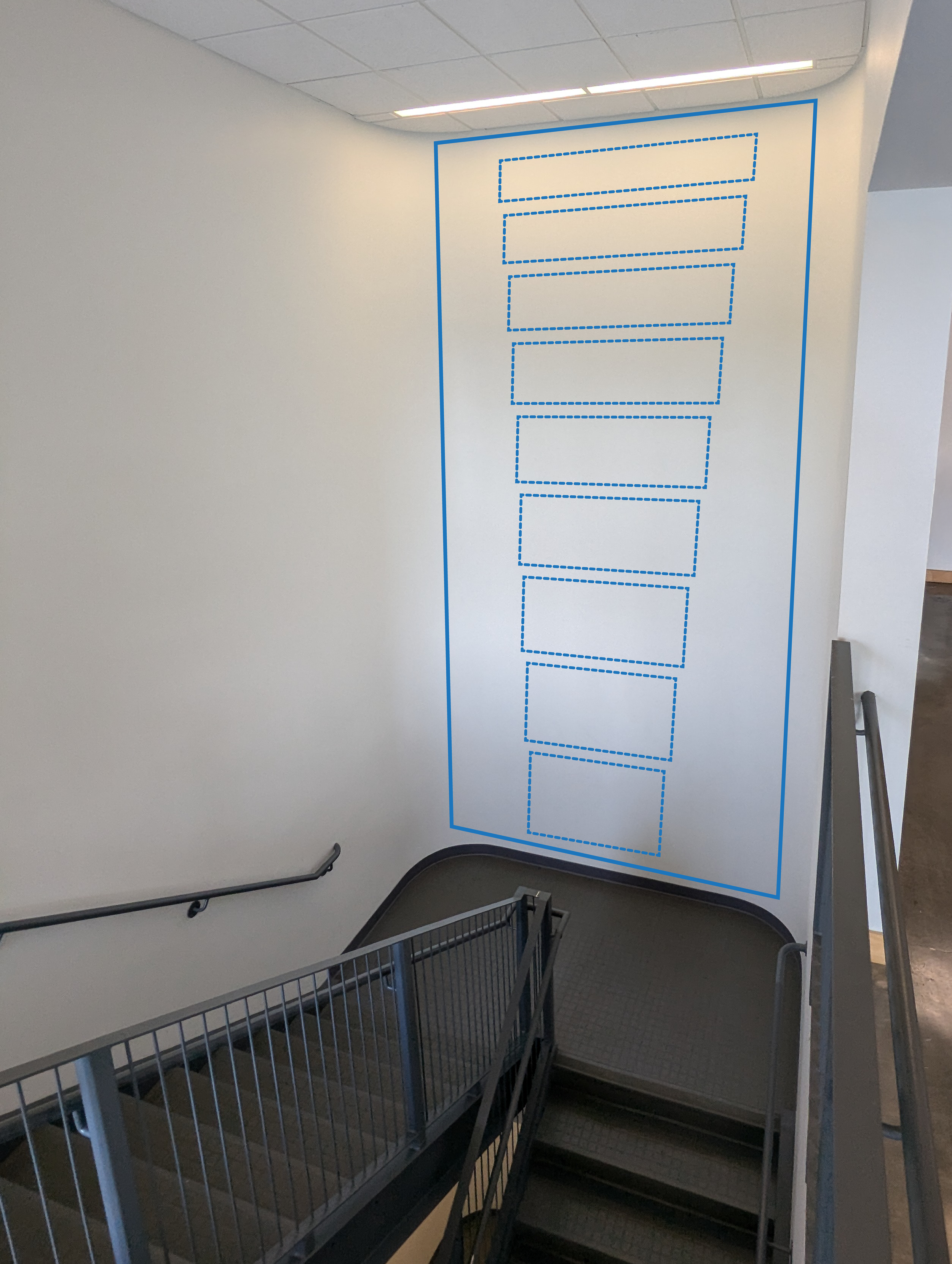 The 9 Circles of Hell installation was on a curved wall, with 17 feet tall and 9 feed wide of space, on the stairwell between the second and third floor of Old Dominion University’s (ODU) Barry Arts Building. A projector was securely mounted onto a cart which projected the animations onto various sized posters representing each floor of Hell.