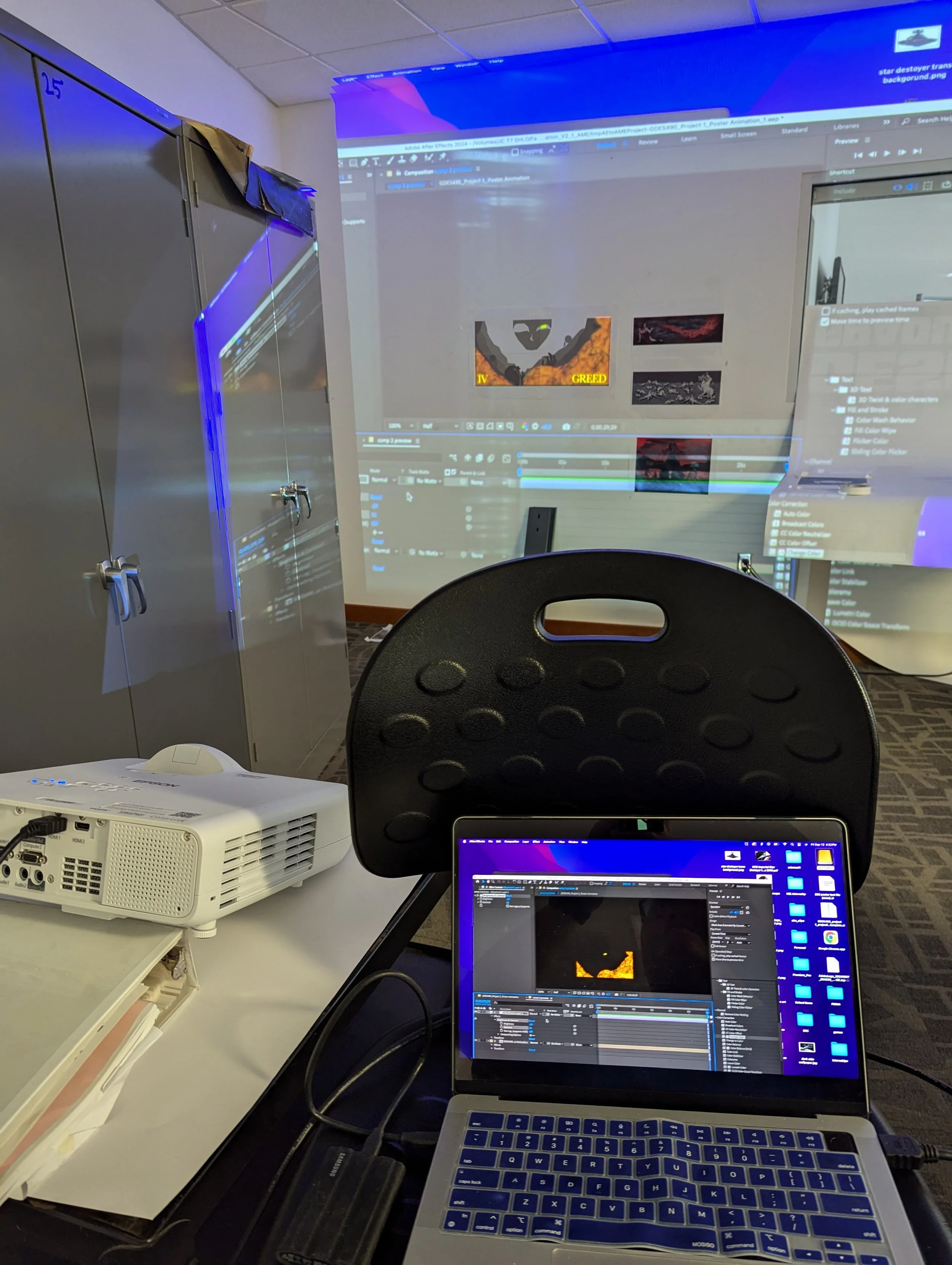 It was powerful experiencing a projector illuminate the poster I designed in a dark hallway. Animating with Adobe After Effects was a new experience, requiring techniques that relied on reflected light instead of the typical emitted light from a screen. It pushed me to design the poster with a flat, rigid aesthetic while incorporating more texture into the animation which enabled me to build a valuable skill set for future projects.